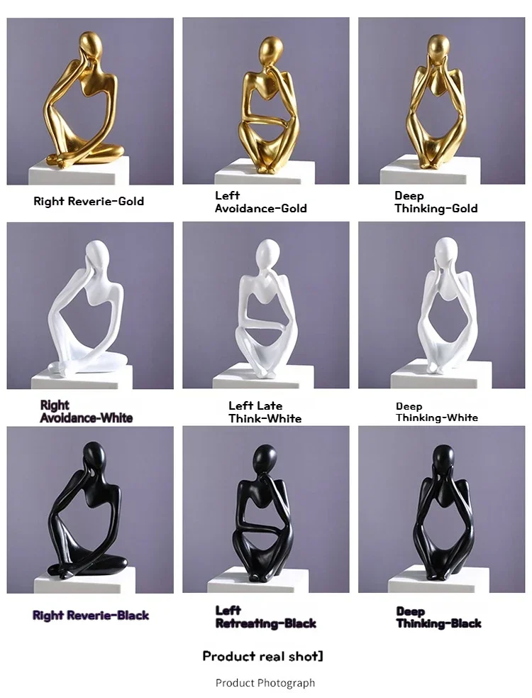 Diese kunstvoll gearbeitete resinbasierte Deko-Figur im modernen Nordic-Stil steht für Stille, Achtsamkeit und Eleganz. Ob als „Right Reverie“, „Left Avoidance“ oder „Deep Thinking“ – jede Variante erzählt ihre eigene Geschichte und verleiht deinem Zuhause einen besonderen Ausdruck von Ruhe und Reflexion. Die minimalistische Formensprache und die edlen Farboptionen machen sie zu einem stilvollen Eyecatcher auf jedem Sideboard, Regal oder Schreibtisch.