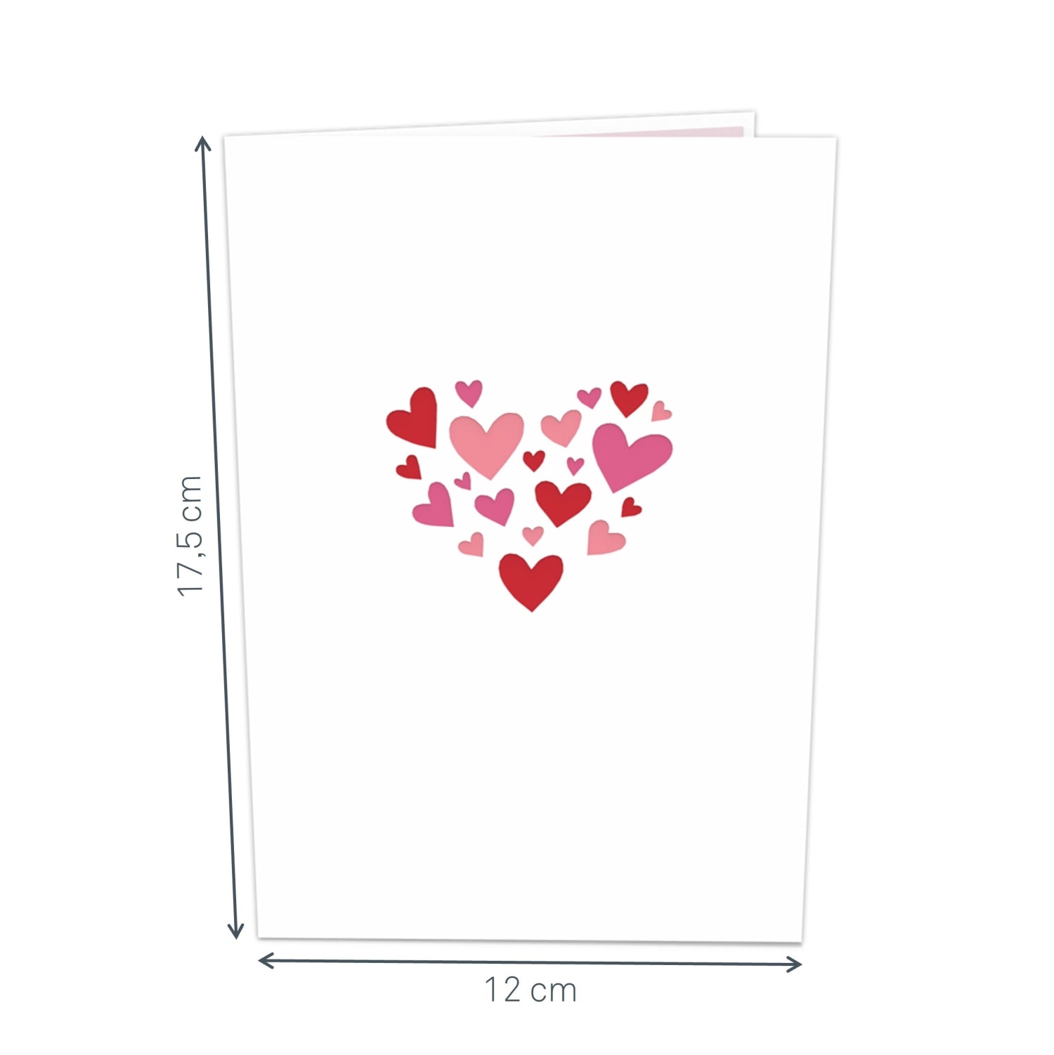 Die Innenseite der Klappkarte ist pastellrosa und mit filigranen Herzen verziert. Eine zarte pinkfarbene Bordüre schmückt den Kartenrand und verleiht der Karte eine romantische Note. Das weiße Außencover besticht durch seine zahlreichen kleinen Herzen, die mit Lasercut Technik geschnitten wurden und zusammen ein großes Herz bilden.