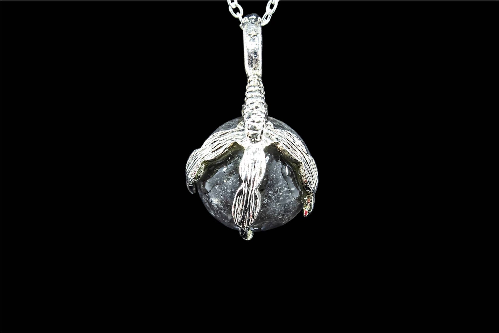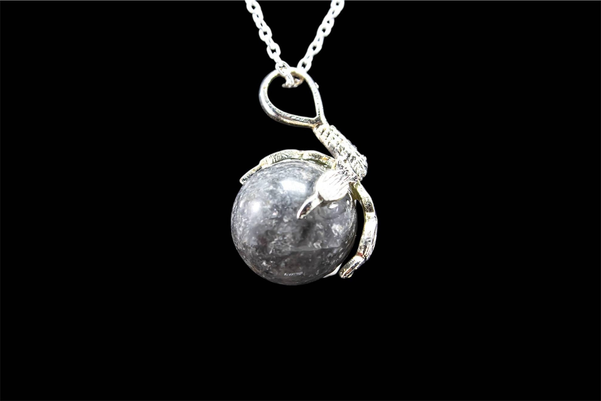 Dieser einzigartige Anhänger kombiniert eine polierte Edelsteinkugel mit einer detailreichen, versilberten Krallenfassung. Jeder Stein wird sorgfältig ausgewählt und von Hand eingesetzt, sodass jedes Stück ein echtes Unikat ist.