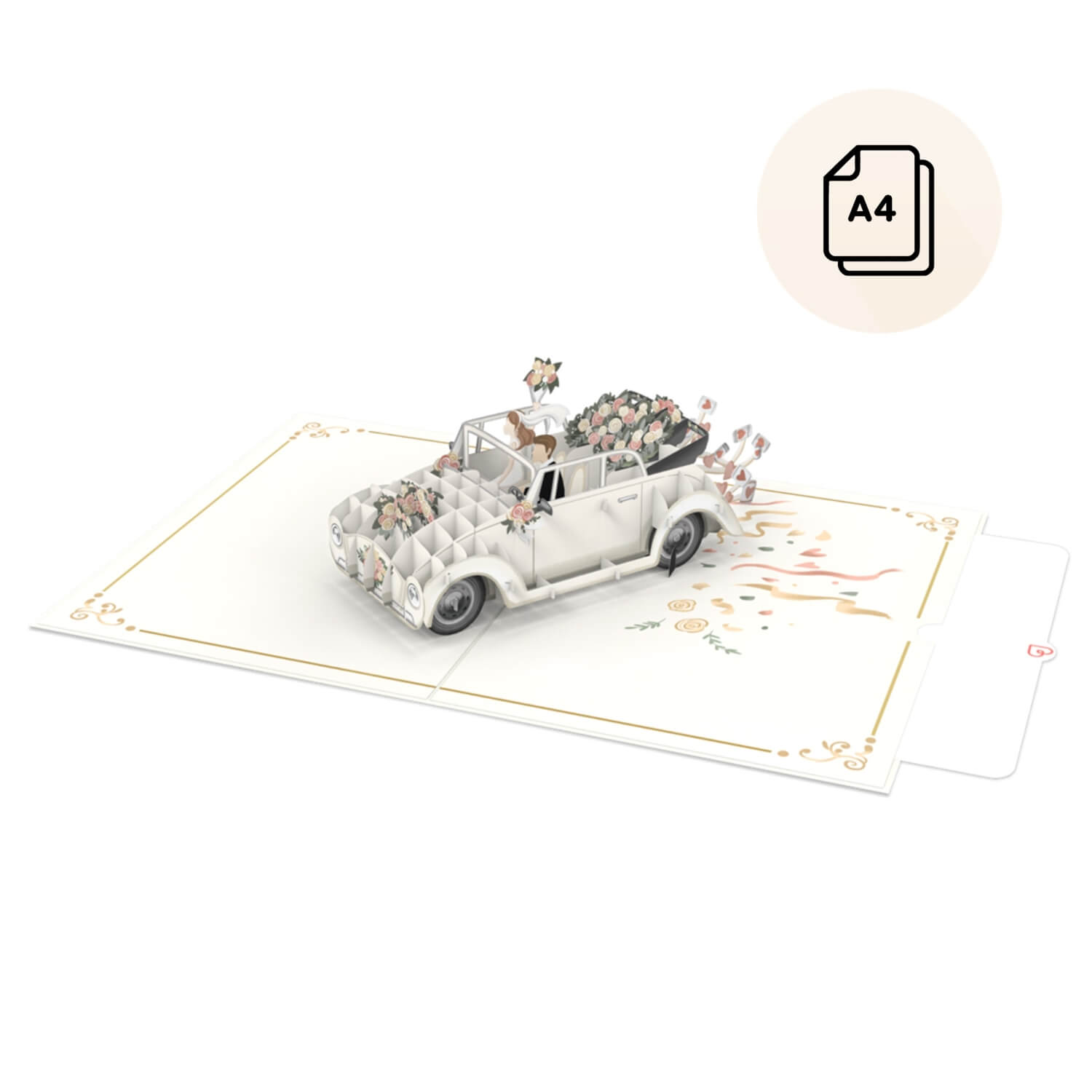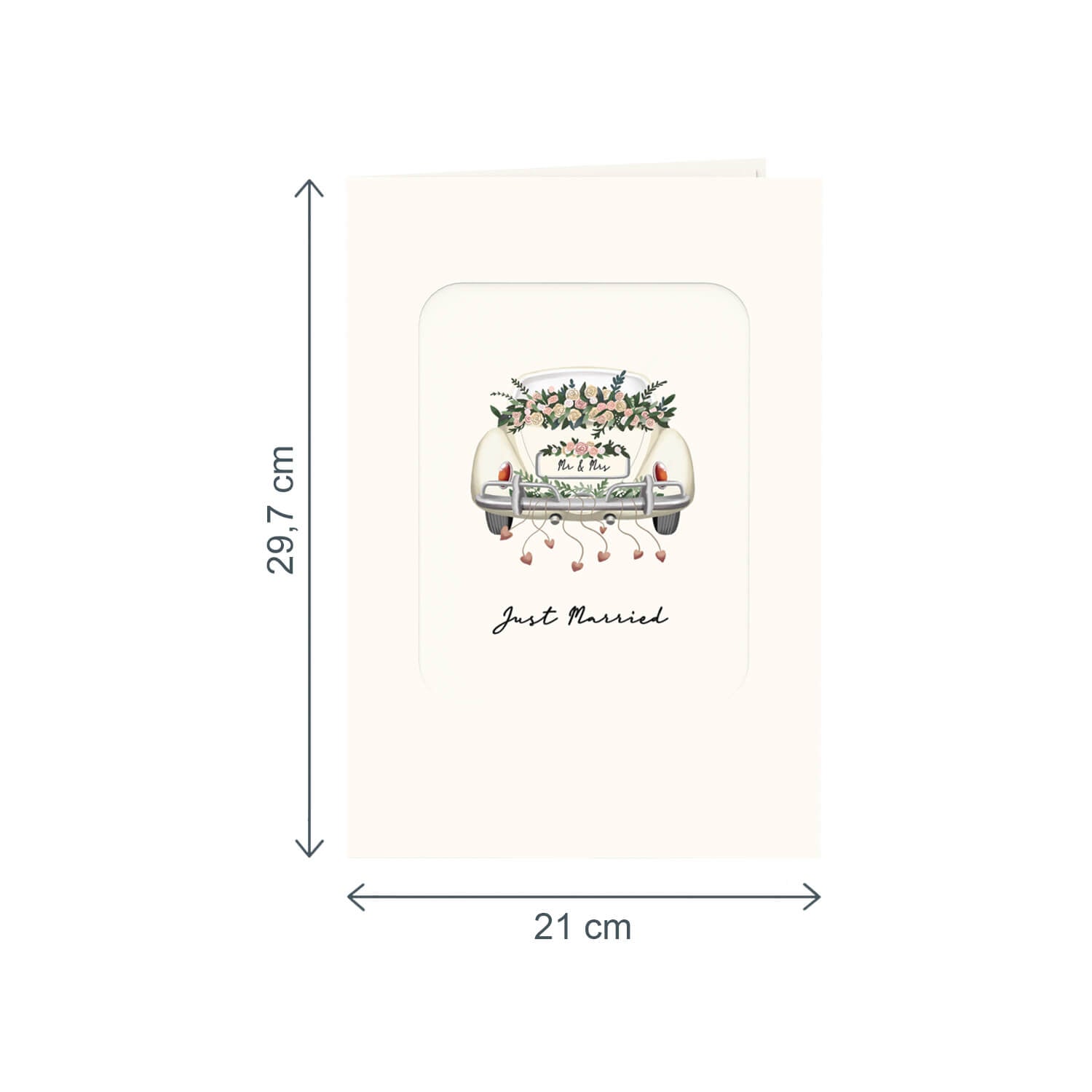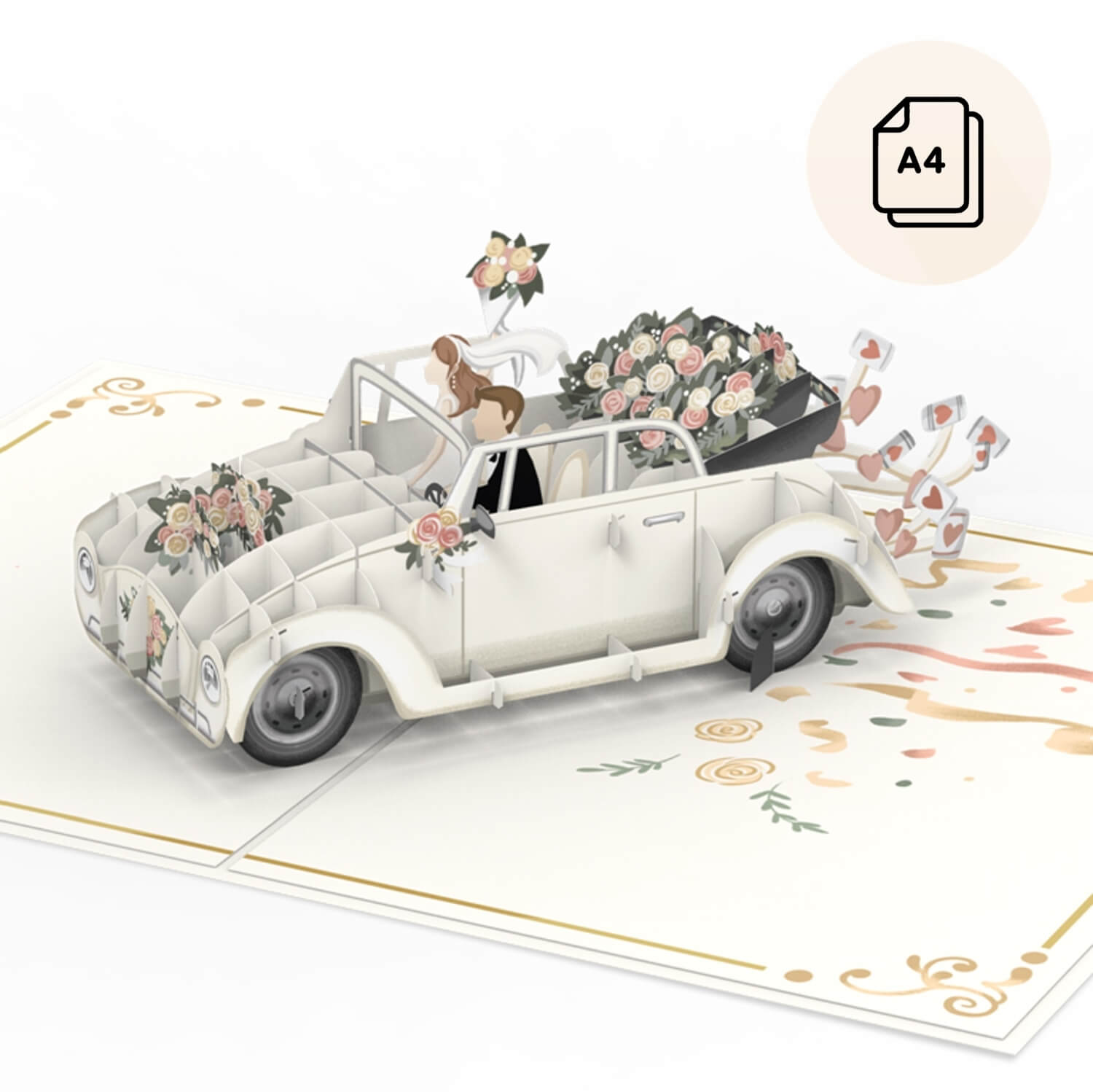 Öffnest du diese eindrucksvolle 3D Karte, springt dir ein weißes Hochzeitsauto entgegen. Dort winkt die Braut mit ihrem Blumenstrauß, während ihr Schleier sanft im Wind flattert. Am Steuer? Der stolze Bräutigam. Jedes Detail, vom pastellfarbenen Blumenschmuck bis zu den romantischen Blechdosen am Heck, wurde liebevoll gestaltet.